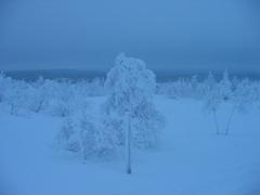 Photo : paysage blanc dans la faible lumière bleue de la Laponie finlandaise (image réalisée sans filtre).