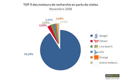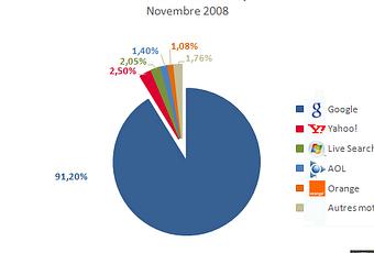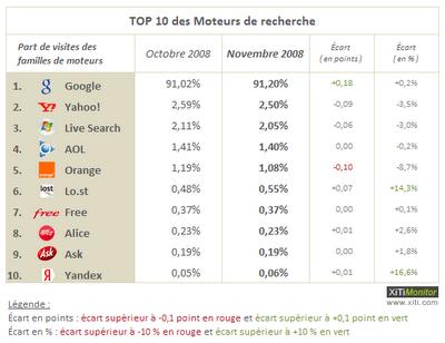 Sans aucune surprise le géant Google est plus fort que jamais. Je tiens ces statistiques de Xiti. La tendance est la suivante Google gagne du terrain, AOL se maintient, les moteurs par pays progresse comme le moteur de recherche russe Yandex... Sinon La grosse progression c'est le petit nouveau lo.st, il n'est pas si nouveau que cela, je le connais depuis déjà plus d'un an. Alors pour tout ceux qui sont pressés comme moi lorsqu'ils font leurs recherches, je tape directement le mot à chercher dans la barre d'adresse et c'est comme cela que j'ai découvert lo.st, ces résultats sont basés sur ceux de Google et il est mis par défaut pour la recherche dans la barre d'adresse de Google Chrome et vu que Google Chrome ne comporte aucun add-ons de recherche comme chez internet explorer et firefox alors le plus simple est de taper son mot dans la barre d'adresse d'où le petit poussin a fait grimper sa part du gateau à 0,07% en un mois pas mal vu que ce qui reste à part Google c'est un modique 9% des parts de marché, bref, Google c'est trop de la balle... Enjoy