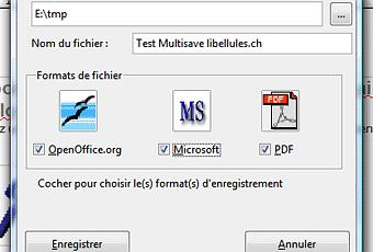 Avec l'extension MultiSave pour OpenOffice, il est possible d'enregistrer un fichier en même temps dans trois formats différents. En tant que ODF, PDF et MS Office. Il suffit de cliquer simplement sur l'icône MultiSave (carré rouge) et de sélectionner dans quels formats le fichier doit être enregistré.