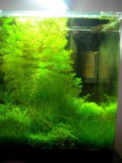 Chose surprenante, la femelle guppy Jamaïca qui restait toute seule est bien arrondie en ce moment, donc ces deux jeunes ne sont pas des naissances d'aujourd'hui, peut être sont-ils nés dès l'arrivée de la femelle dans le bac, car à un moment elle est apparue beaucoup plus plate... Sur la photo suivante, la femelle et les deux jeunes sont en haut à droite, devant le filtre. Pas facile à photographier car ce sont des miniatures et de couleur grise transparente.