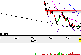 Le biseau baissier a bien cassé à la hausse et maintenant le titre va bûter contre sa moyenne mobile à 50 jours mais ce sera qu’une simple formalité vers un objectif plus que jamais d’actualité à 1.40€. On conserve les positions pour suivre cette tendance haussière.