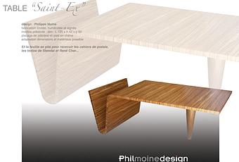 Philippe Moine est designer industriel mais il crée aussi du mobilier et sa dernière fabrication est la table « Saint Ex » en placage de zébrano et le pied en chêne, dim : 120/ h 42/ P 60. Fabrication limitée numérotée et signée.