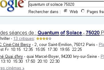 Lancé il y a quelques semaines déjà, j’étais complètement passé à coté de cette fonctionalité de Google qui balance les salles, les horaires, et les critiques d’un film, si son nom est saisi dans Google accompagné du code postal…bim.