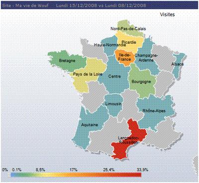 t'è je ne l'avais pas fait depuis longtemps, je vous mets la carte des visiteurs de ce blog d'hier. Elle est assez représentative de ce qui se passe ici tous les jours. Ne figure pas ici les visiteurs de Suisse (je sais qui c'est), Belgique, Etats-Unis et Tunisie mais je pense à vous :)