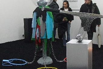 La station : ce n’est qu’un lieu précaire, hébergeant un collectif SDF qui regroupe des artistes sans projet commun articulé. Des pièces plus ou moins originales, mais qui ne dialoguent pas entre elles, mais semblent vouloir surenchérir dans le spectaculaire. La bouche rouge de Natacha Lesueur se bat pour votre attention avec la sculpture voyante de Jacques Julien, la raquette/pétanque pop de David Ancelin est en compétition avec le micro-onde champignonné d’Emilie Perotto. Rien de très excitant, sauf les quatre coulées de laque noire sur les murs, pollution oubliée, oeuvre discrète de Cédric Teisseire, la seule (discrète) de l’exposition. Ci-contre une mauvaise vue d’ensemble.