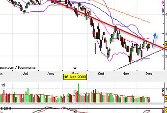 Le CAC 40 après s'être maintenu au-dessus de sa moyenne mobile 20 jours marque clairement son intention de passer au-dessus de sa moyenne mobile à 50 jours maintenant pour lâcher les chevaux vers un objectif à 3500 points. Le début 2009 devrait poursuivre sur ce rebond mais celui-ci devrait également n'être que technique et donc éphémère mais profitons déjà d'un peu de vert.