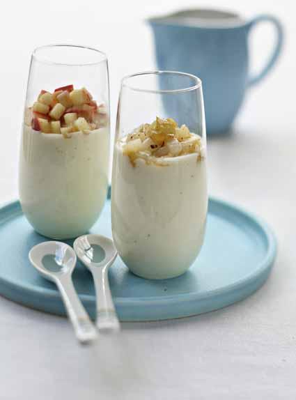 - Au moment de servir, couper la pomme et la poire en petits dés et verser les chacun dans une casserole.