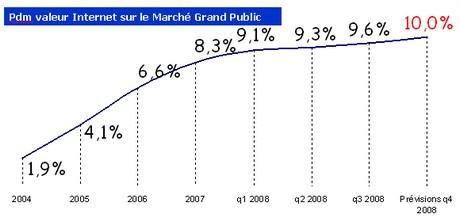 Avec une chiffre d’affaires TTC mesuré selon GfK à 327 millions d’€uros à fin septembre 2008, Internet réussit la performance de développer son chiffre d’affaires sur chaque marché, y compris sur la musique ou la vidéo, pourtant en régression.