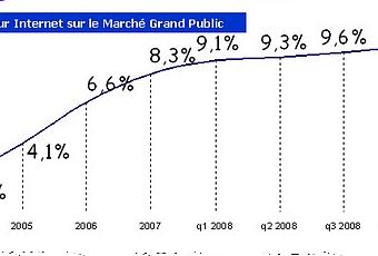 On enregistre ainsi une progression de 60% du chiffre d’affaires d’Internet sur les marchés des loisirs interactifs (+29% pour le marché), et du livre avec 33% de chiffre d’affaires additionnel sur un marché en légère régression (-1,5%). Sur Internet, le marché du livre est ainsi passé devant celui de la vidéo en chiffre d’affaires, avec près de 135 millions d’€uros réalisés en 2008, pour atteindre 6% du marché, soit une progression d’un point et demi de part de marché. Pour autant c’est toujours sur le marché de la vidéo qu’Internet enregistre sa meilleure performance avec quasiment 11% de parts de marché (+1 point).