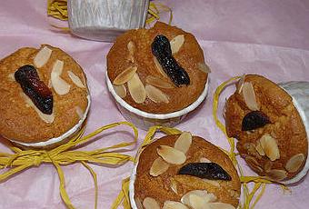 4- Verser dans des caissettes une bonne cuillère de pâte puis déposer une cuillère de crème de calisson. Terminer par recouvrir de pâte jusqu'au 2/3 de la caissette.