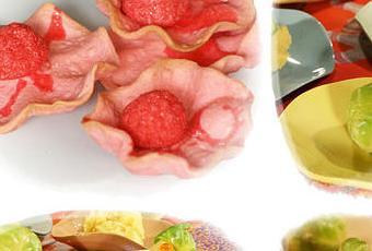 Petites coupelles à tout faire, notamment à revisiter les associations traditionnelles : choux, pommes de terre, poisson fumé ! Petites bulles d'air en choux de Bruxelles (éventuellement glacés au jus d'orange) et purée de patate douce assaisonnée de pâte de citron confit au gingembre et oeufs de saumon.