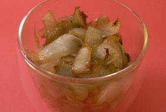 Ingrédients (4 personnes) : 4 endives - 20 g de beurre - 2 cuillères à soupe de miel - 1 pincée de curry en poudre.