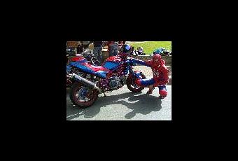 Moins connue des cinéphiles, la moto de Spiderman a été récemment aperçue en Italie lors d'une concentration. Vous pensiez qu'il n'avait pas de moto ? Détrompez-vous. Original s'il en est, l'homme araignée roule en Cagiva 1000 V-Raptor.