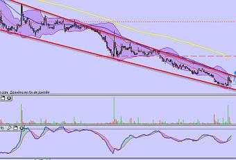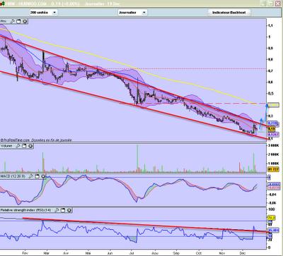 La situation sur Hubwoo veut se montrer explosive. Le titre évolue maintenant depuis plus d’une année dans un biseau descendant qui l’a mené sur des plus bas historiques vers 10 centimes d’euros. Le titre avec de forts volumes jeudi semblent vouloir tenter une sortie haussière et un renouveau. La figure du biseau descendant est de plus à son terme. Le même trend baissier sur le RSI a lâché et la moyenne mobile à 20 jours en rouge sur le graphique (agrandissable par simple clic ) semble soutenir la tendance haussière que le titre Hubwoo semble démarrer. Dans ce contexte on devrait pouvoir ouvrir une position sur 0.18€ pour tenter d’accompagner une éventuelle poursuite haussière d’Hubwoo vers un test des 0.27€ puis 0.33€.