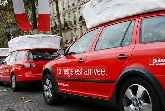 Une opération originale de street marketing a été organisée par l’Office de Tourisme Suisse dans les rues de Paris afin de faire promotion des stations de ski Helvétiques. De quoi donner des idées aux amoureux de la glisse, adepte de sensations fortes, de fromages, de chocolats, de bijoux et de banques…