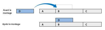 Un montage par remplacement est similaire au montage par écrasement. De tous les types de montages, le montage par remplacement est le seul qui n’utilise pas les points de montages définis dans le visualiseur.