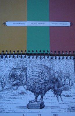 Voilà, c'est donc ça le « Bestiaire Universel », un livre dont le procédé est vieux comme le monde et qui permet des associations assez surréalistes. Je n'ai pu m'empêcher, en le feuilletant de repenser à mon enfance, quand une grande marque de yaourts avait utilisé ce même procédé, cette fois-ci avec des personnages humains. Il suffisait de poser les uns sur les autres trois de ces pots de yaourt en carton paraffiné (un pour la tête, un pour le corps et un pour les jambes) pour créer des personnages aux morphologies et aux costumes étonnants. Hé oui ! Il fut une époque (pas si lointaine finalement) où les enfants pouvaient jouer pendant des heures avec des pots de yaourt vides.