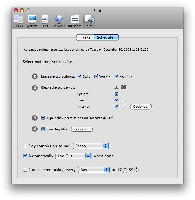 Qu’est-ce donc qui justifie cet écart de prix ? Un petit rien du tout, en fait, mais qui risque tout de même d’intéresser certains et certaines d’entre vous : Cocktail permet de programmer l’horaire des tâches de maintenance. Bien utile pour qui a l’habitude d’éteindre son Mac la nuit, moment où Mac OS X effectue ces tâches, et ne pense pas toujours à faire régulièrement ce petit ménage salutaire pour le système d’exploitation.