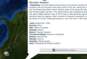 C’est vendredi, détendez-vous en écoutant les sons de la nature disponible sur la nouvelle carte de Wild Sanctuary. Chaque son est positionné et expliqué, incluant de l’information sur le contexte de l’enregistrement (saison, climat, météo, etc.). Le patron de l’entreprise, le bioacousticien Bernie Krause, estime que 40% des sons disponibles dans ses archives de 40 ans sont maintenant disparus avec les habitats ou altérés par le bruit humain.