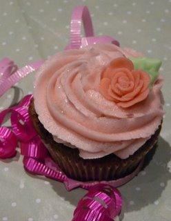 Today is Jen's birthday and here are some special cupcakes baked just for her. I'm calling them "French Kiss" cause it was baked with love here in Paris. And because, a French Kiss was our cocktail of choice one hot summer in Manhattan. It was introduced to us by our favorite bartender, Kathy, at the now defunct Mugamba Bay on the Upper West Side. A French Kiss is a cocktail made from a mixture of vodka, chambord, creme de cacao and half and half (or cream). This is a chocolate cupcake, stuffed with a creme de cacao ganache and topped with raspberry Chambord buttercream and a hand-made marzipan rose. To finish it off, I sprinkled some Wilton's edible silver glitter which I found from a seller on ebay.co.uk who (lucky for me!) carries lots of the those hard to find cupcake decorations I have been ogling on US sites.
