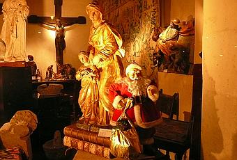 Pour en finir avec les Pères Noël de banlieue, objet d’une note qui avait suscité quelques commentaires particulièrement déplaisants, un Père Noël parisien, aperçu cet après-midi dans la vitrine d’une antiquaire du très chic et précieux quai Voltaire, bois doré d’une vierge 18ème et velours rouge d’un Père Noël 21ème siècle pour des fêtes de fin d’année au goût sûr et raffiné ;-)