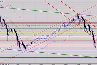 Le graphe mensuel de décembre montre que nous en sommes à notre 4 ème marteau takuri apparu depuis mi 2007 (A,B,C, et D)Après chaque marteau, nous avons pu observer une réaction haussière de 200 à 400 points sur le CAC, immédiatement suivie d'un ample mouvement baissier créant un nouveau plus bas. En sera-t-il de même ici?