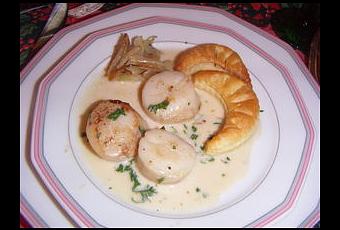 La suite du repas de Noël après les verrines de saumon fumé : des noix de St Jacques poêlées au beurre, accompagnées de fenouil braisé et d'un fleuron.