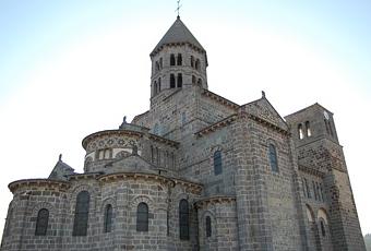 L'église de Saint-Nectaire en trachyte gris clair, dont le clocher du transept a été totalement reconstruit, est exposée en grande vue sur le mont Cornadore. Elle offre au soleil levant une merveilleuse abside aux savants ordonnancements où son rose quelque peu frotté d'or par le lichen rayonne de paix sur le fond des sapins. Des chapelles de l'abside s'élancent du chevet - sobrement décoré d'une frise délicate et d'arcatures - jusqu'à la pointe du clocher. Détruit en 1794, il fut reconstruit à l'imitation du clocher de Saint-Saturnin, ainsi que les tours de la façade.