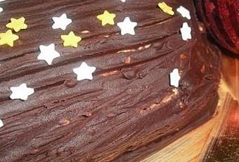 Déroulez le biscuit et retirez le torchon. Nappez le biscuit de ce mélange et enroulez-le de nouveau sur lui-même. Recouvrez la bûche de crème au chocolat puis décorez-la en la striant à l'aide d'une fourchette. Tenez la bûche au frais jusqu'au lendemain.