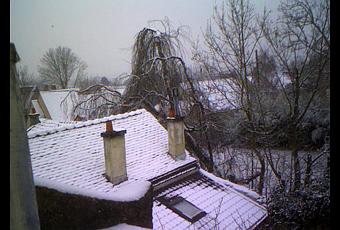 Ce matin depuiS bien avant le lever du jour, il neige dru sur Montmorency… De la “poudreuse” qui tient bien ! Joli spectacle… à regarder de mes fenêtres car je ne me risquerais sûrement pas à mettre le pied dehors. Je pourrais sans doute chausser des crampons sous mes semelles mais cassage de gueule néanmoins garanti : je n’ai pas encore trouvé une canne anglaise ferrée ! Je pourrais certes prendre un vieux bâton de ski mais le sens du ridicule me retient… C’est pourtant ce que j’ai vu souventes fois faire par les femmes âgées de La Grave. Mais Montmorency n’est pas un village de montagne.
