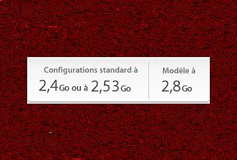 - Processeur Intel Core 2 Duo à 2,66 GHz avec 6 Mo de mémoire cache N2 partagée s’exécutant à la vitesse du processeur ; ou processeur Intel Core 2 Duo cadencé à 2,93 GHz avec 6 Mo de mémoire cache N2 partagés