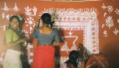 *source de peinture rituelle Cauk pour une cérémonie de mariage (lire le lien très instructif) dans la tribu des Warli en Inde