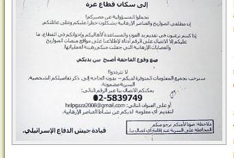 Si vous souhaitez porter assistance, aider vos familles et frères à Gaza, tout ce que vous devez faire est d’appeler le nº de téléphone ci-dessous pour nous informer sur la localisation des lanceurs de roquettes et des gangs terroristes qui vous ont fait otages de leurs opérations.