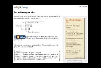 Google Reader permet de placer un clip (une liste des titres d'articles) sur son site. L'option put a clip on your site de l'onglet settings permet de créer le code javascript correspondant.