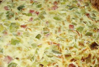 Mettre un peu de gruyère râpé sur le fond de tarte ( une petite poignée environ), ajouter les dés de jambon et les poireaux.