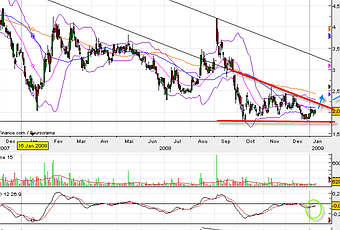 Et surement un rattrapage vers les 3€. Surement car le trend baissier pourrait être cassé à la hausse prochainement, actuellement graphique le titre semble être ramassé sous ses moyennes mobiles courtes, mais un boost pourrait avoir lieu pour envoyer les cours sur 2.40€ dans un premier temps puis après consolidation une seconde montée pourrait permettre de fermer un gap ouvert sur les 3€. Au niveau du Rsi on peut racer également un flag qui en cas de sortie haussière validerait le potentiel haussier. En fin la MACD vient de repasser au-dessus de sa moyenne, alors signal d’achat ? Il ne manque plus que du volumes pour le confirmer.