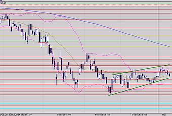 La baisse s'est poursuivie ce jour sous le support immédiat des 3270 points formé par les 2 dernières bougies.Le prochain support se situe sur les 3218 points (non loin de notre oblique basse du biseau) qui correspond également au retracement de 62% du dernier mouvement haussier.
