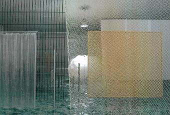 Through (A travers) est une immense installation qu’on doit décrire en trois temps : d’abord, sous nos pieds, le verre pilé que nous écrasons bruyamment à chaque pas, détruisant encore plus l’oeuvre de manière, je l’avoue, assez jouissive (mais, d’abord, seul dans la salle, je n’ose pas, je demande la permission au gardien). On ressent le danger, on transgresse un interdit, on brise des contraintes. Ensuite, devant nous, des barrières transparentes, organisées en six carrés homothétiques, bloquent ma voie, mais pas ma vue; ce sont des barrières, des claies, des rideaux de perles, des stores, des grillages, des rideaux de douche, des barbelés, des panneaux de verre et des aquariums où même les poissons sont transparents. Et le spectateur tente d’avancer dans ce faux labyrinthe, contourne, évite, navigue entre les obstacles, tout en pilant joyeusement le verre au sol.