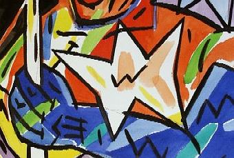 Toujours des portraits, beaucoup de couleurs, un mélange de traditions expressionnistes, d’abstractions géométriques, d’imbrications liés par une certaine idée de stylisation et construite comme un puzzle, un jeu se crée alors avec l’artiste, on est pris en otage, dans la bonne humeur, le plaisir et avec notre consentement dévoué, pour assembler les pièces!!!