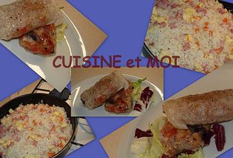 Pour 10 nem's : 2 escalopes de volaille, 1 poivron rouge, 1 oignon, une pincée de gingembre en poudre, 50gr de vermicelle chinois, 8 galettes de riz et quelques gouttes de sauce sojas. Couper le poivron, l'oignon, les escalopes en petits morceaux, faite revenir le tout à la poêle avec une càs d'huile, ajouter en fin de cuisson quelques gouttes de sauce sojas la pincée de gingembre et réserver. Pendant ce temps faites tremper les vermicelles chinois dans de l'eau tiède10mn et égoutter. Passer les galettes de riz quelques secondes dans de l'eau tiède pour les ramollir ensuite disposer une càs de volaille sauté au poivrons et un peu de vermicelle chinois sur la feuille de riz ramolli, replier deux cotés et rouler le nem's, répétez l'opération pour les autres feuilles de riz et faire frire ces nem's à la sauteuse ou friteuse, servez avec une salade verte, des feuilles de menthe fraîches et/ou du riz cantonnais. Pour le riz cantonnais, j'ai utilisé du riz surinam, pour 5 pers : 400gr de riz surinam, 1 oignon, 1 carotte, une petite omelette de deux oeufs coupé en dés, 100gr de dés de jambon, sel et poivre. Faire revenir l'oignon et la carotte en dés dans une sauteuse sur feu vif avec une càs d'huile mais sans coloration, ajouter le riz, bien mélanger, incorporer un volume 1/2 d'eau, saler poivrer et faire cuire à couvert pendant une vingtaine de minutes, ajouter le jambon et l'omelette en dés au moment de servir. (on doit mettre des petits pois aussi dans le riz, au moment de la préparation je n'en avait pas). Voilà, bon appétit les amis.
