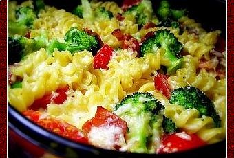 Battre les oeufs avec la crème, du sel et du poivre. Verser le mélange sur les pâtes. Ajouter la préparation au bacon et à l'oignon, les brocolis, les tomates cerises et la mozarella râpée. Bien mélanger.