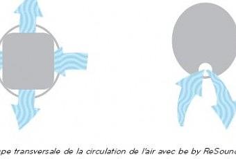 Pour être confortable, la partie d’une aide auditive portée dans le conduit doit s’adapter parfaitement aux replis de ce dernier, qu’elle soit réalisée à l’aide d’un moulage ou d’un matériau malléable. Pour obtenir une adaptation ouverte, il faut alors percer cet embout d’évents. Avec son design contraire à l’intuition, be by ReSound™ réussit le tour de force d’être open grâce à un contact minimal avec le conduit auditif de l’utilisateur. La Figure 2 présente deux coupes transversales : la première étant celle de be by ReSound™ inséré dans le conduit auditif et la seconde, celle d’une aide ITE réalisée sur mesure dans la même configuration. Une fois placé dans le conduit auditif de forme ovale, le volume rectangulaire de be by ReSound™ permet à l’air de circuler librement autour de l’unité canal auditif modulaire. Le microphone étant situé à l’extérieur du boîtier, la taille de l’unité à insérer dans le conduit a pu être réduite de façon à s’adapter au plus grand nombre de conduits auditifs. Dans cet article seront exposés les résultats démontrant que be by ReSound™ offre les mêmes avantages que les micro-BTE open, en d’autres termes un design non occlusif, un confort optimal et une amplification naturelle pour les patients souffrant de pertes auditives faibles à moyennes dans les hautes fréquences.