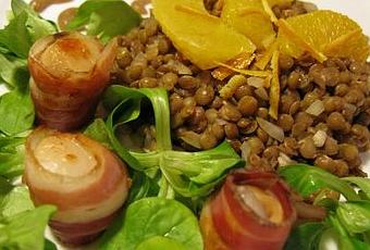 - Dressez les lentilles dans l'assiette, placez quelques suprêmes d'orange dessus. Disposez 3 noix de St-Jacques, de la mâche autour et un peu de sauce.