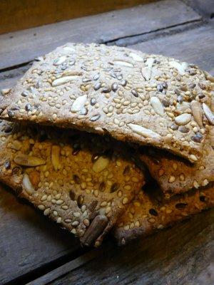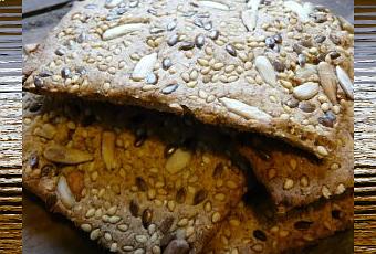 Dans le bol du robot déposez la levure , délayez la avec un peu d'eau . Ajoutez les farines ,le beurre , le sel et le reste de l'eau .Étalez la pâte sur un papier sulfurisé recouvert de graines (ainsi en étalant la pâte les graines viendront s'insérer délicatement). Étalez la pâte au rouleau ,avec un peu de farine si nécessaire ,pour obtenir une épaisseur de 0,5 cm . Découpez avec une roulettes , un couteau ou des emportes pièces des morceaux de pâte . Déposez les sur une plaque à pâtisserie recouverte d'un papier sulfurisé et faites cuire 7à 10 minutes dans un four préchauffé à 230°C . Ils durcissent un peu en refroidissant et doivent être croquants . Ils accompagnent le saumon fumé , le jambon , une tranche de fromage ou se mangent nature . Vous pouvez les conserver dans une boite en métal durant 3/4 jours.
