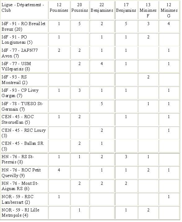 Voici pour chaque club, la répartition des patineurs par catégorie :