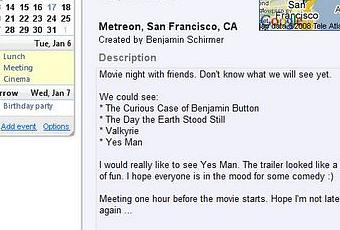 Lorsque vous cliquez sur un événement sur le gadget, une fenêtre avec le détail de votre rendez-vous apparaît. Vous y trouverez sensiblement les mêmes informations que sur la version originale de Google Agenda. Heure de début et fin de la rencontre, liste des participants et le plan de l’endroit où se tiendra votre rendez-vous. Vous pourrez aussi créer un nouvel événement depuis votre gadget. Malheureusement, vous ne pouvez pas inviter de participants.