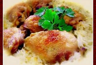 Ajouter le riz et couvrir. Laisser frémir à feu doux jusqu'à ce que le riz soit cuit "al dente". Distribuer le riz et son bouillon autour des morceaux de poulet, dans le plat à four.