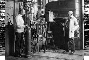 Je viens de faire une analyse sur BibNum au sujet de la première liquéfaction de l’hélium réalisée en 1908 par Heike Kamerlingh Onnes au laboratoire de Leyde aux Pays-Bas : voir l’analyse sur Bibnum. L’analyse s’appuie sur le communiqué fait à l’Académie des Sciences où il décrit son expérience et sa découverte de l’hélium liquide. Il atteint alors la température de 1,65 K (-271,5 °C), la plus basse jamais atteinte par l’homme à cette époque. On peut voir sur la photo ci-contre H.K. Onnes (à droite) et G.J. Flim (à gauche), le chef du laboratoire de cryogénie, devant le liquéfacteur d’hélium à l’université de Leyde en 1908.