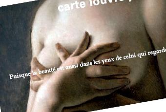 carte Louvre jeunes 2008 - 2009. On y voit le buste d’une jeune femme qui cache ou laisse deviner de façon discrètement érotique ses seins nus. C’est une artiste contemporaine du nom