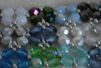 Voilou un essai de bracelet tout en perles de Boheme de couleurs bleu vert, et avec des perles de rocailles argenté 11/0.